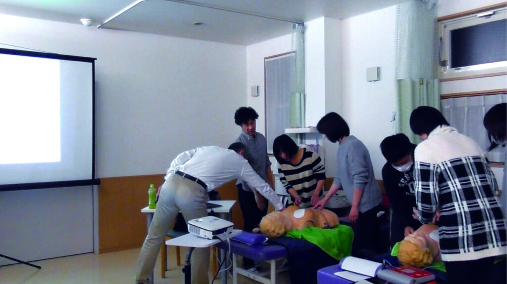 院長を先頭に26名の職員が心肺蘇生法(胸骨圧迫・AED等)の実技を汗だくになりながら行いました。