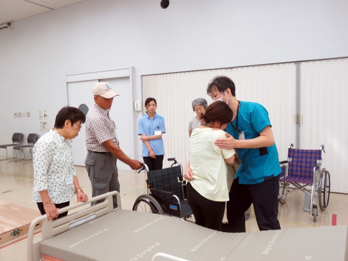 「なかがわ整形」と「いつもリハ菊南」から1名ずつ理学療法士が講師として参加し、寝返り・起き上がり・立ち上がりなどの基本動作介助、車椅子⇔ベッドの移乗介助動作などを指導しました。