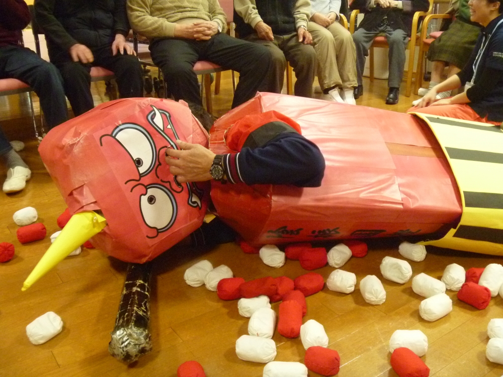 鬼に扮したスタッフに皆様、一生懸命お手玉を投げていらっしゃいました