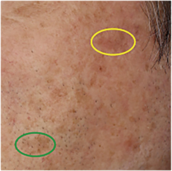 〇血管拡張が少ない色素斑、〇血管拡張がみられる色素斑