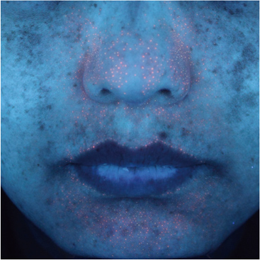 にきび肌の原因でもあるアクネ菌の代謝物であるポルフィリンが赤く蛍光します。