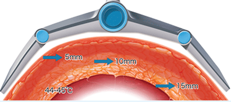 皮下10mmを焦点として、5mm〜15mmの組織を44℃〜45℃を維持しながら加熱し、30分~40分間の短時間で治療を行ないます。