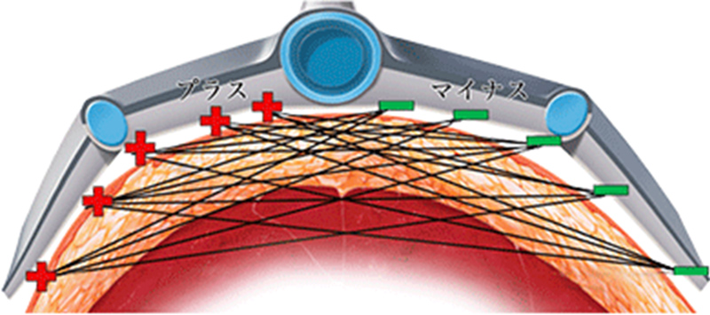 1秒間に2,700万回の早さで+とーが交互に入れ替わる複数の電極から高周波エネルギーが照射されます。