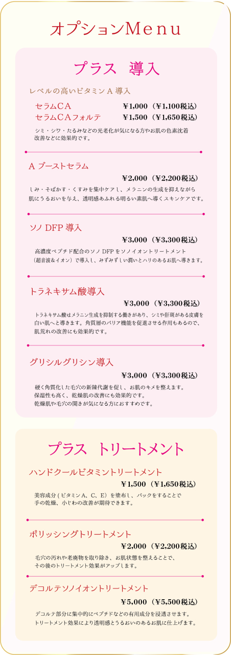 ※当院の施術コース『セレブコース・パール肌コースにつきましては、看護師による施術の場合、税抜き表示価格より5,000円OFFとさせて頂きます。