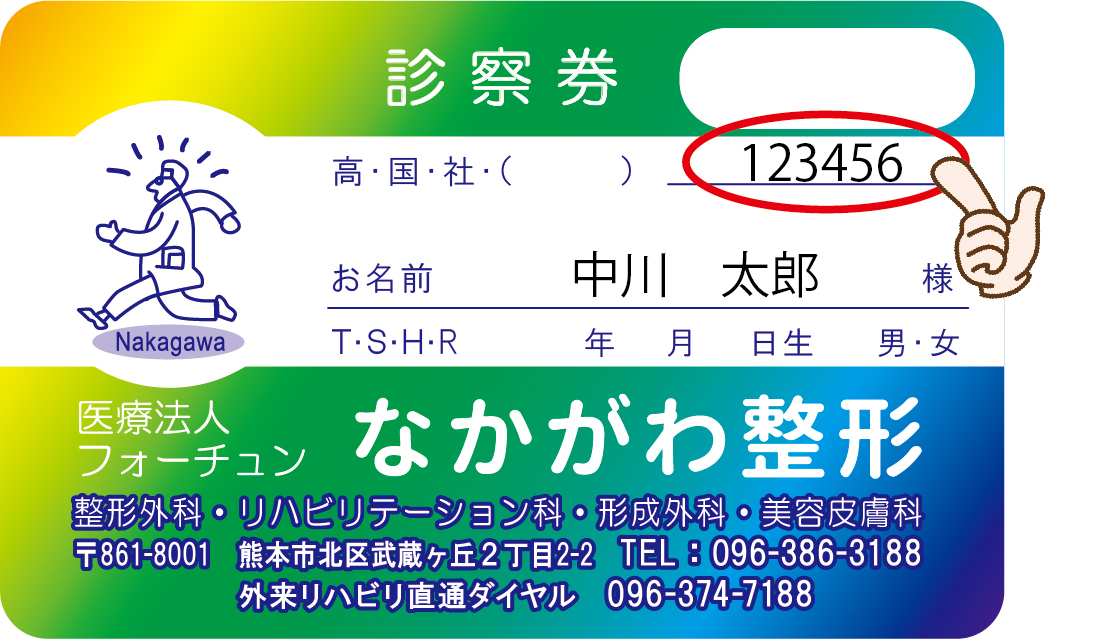 お手持ちの【なかがわ整形診察券】に記載されています患者様番号を入力ください。