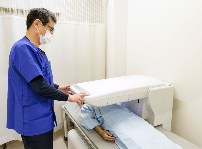 当院では、腰椎・大腿骨で正確に骨密度を測定できるDEXA法の機器を導入しています。女性では、60歳以上で約20%、70歳以上で約30%、80歳以上で約50%の方が骨粗鬆症とされています。早期に発見・予防することで、転倒による骨折や骨折に伴う寝たきり・要介護状態のリスクを減らすことが可能です。