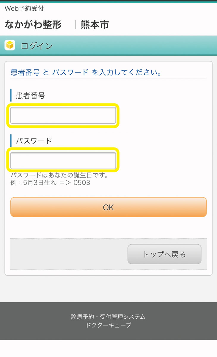 パスワードは患者様の誕生日となっております。(例:5月3日生まれ⇒0503)